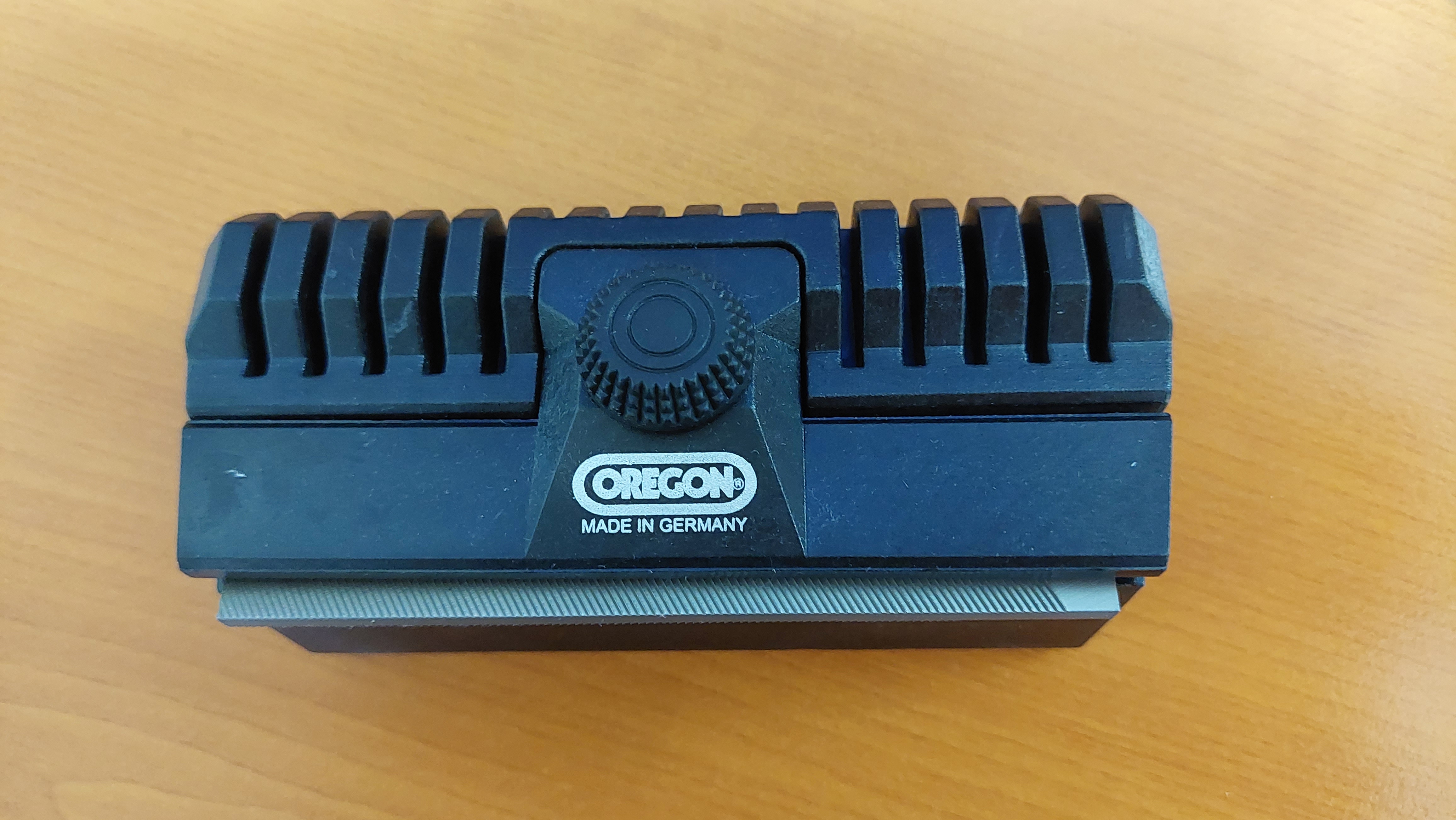 Přípravek k zarovnávání poškozených hran vodících lišt Oregon. Součástí dodávky je jemný pilník.